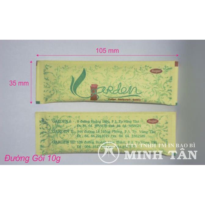 Quảng bá hình ảnh thương hiệu với Đường gói mẫu 7 Minh Tân. Kích thước 105x35mm. đóng đường trắng, đường vàng, đường kiêng trọng lượng 10g. In trên giấy màng phức in 1 màu hoặc 2 màu, thiết kế theo yêu cầu quý khách.
